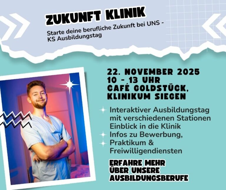 Unter dem Motto „Zukunft Klinik – Starte deine berufliche Zukunft bei UNS“ lädt das Klinikum Siegen am 22. November 2025 von 10 bis 13 Uhr zum Ausbildungstag ein. Die Veranstaltung findet im Café Goldstück des Klinikums statt und richtet sich an Jugendliche ab Klasse 8, deren Eltern sowie an Berufs- und Studienberater.
